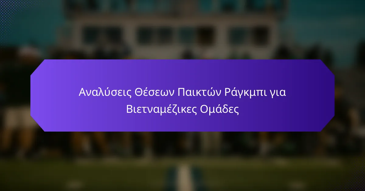 Στο βιετναμέζικο ράγκμπι, η κατανόηση των βασικών θέσεων των παικτών, όπως οι επιθετικοί και οι αμυντικοί, είναι απαραίτητη για την ενίσχυση της στρατηγικής και της απόδοσης της ομάδας. Κάθε θέση έχει μοναδικές ευθύνες που επηρεάζουν σημαντικά τόσο την επιθετική όσο και την αμυντική δράση, καθιστώντας ζωτικής σημασίας για τις ομάδες να χρησιμοποιούν εργαλεία ανάλυσης για να αξιολογούν την αποτελεσματικότητα των παικτών και να βελτιστοποιούν την εκτέλεση του παιχνιδιού.